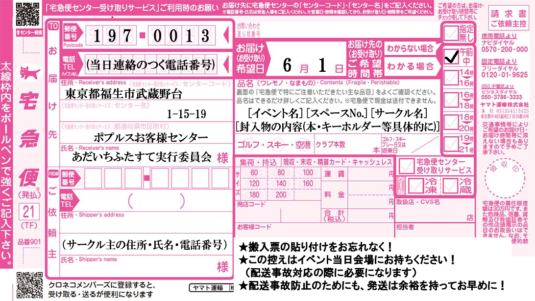 - 品名: イベント名, スペース番号, サークル名, 封入物の内容を記入してください